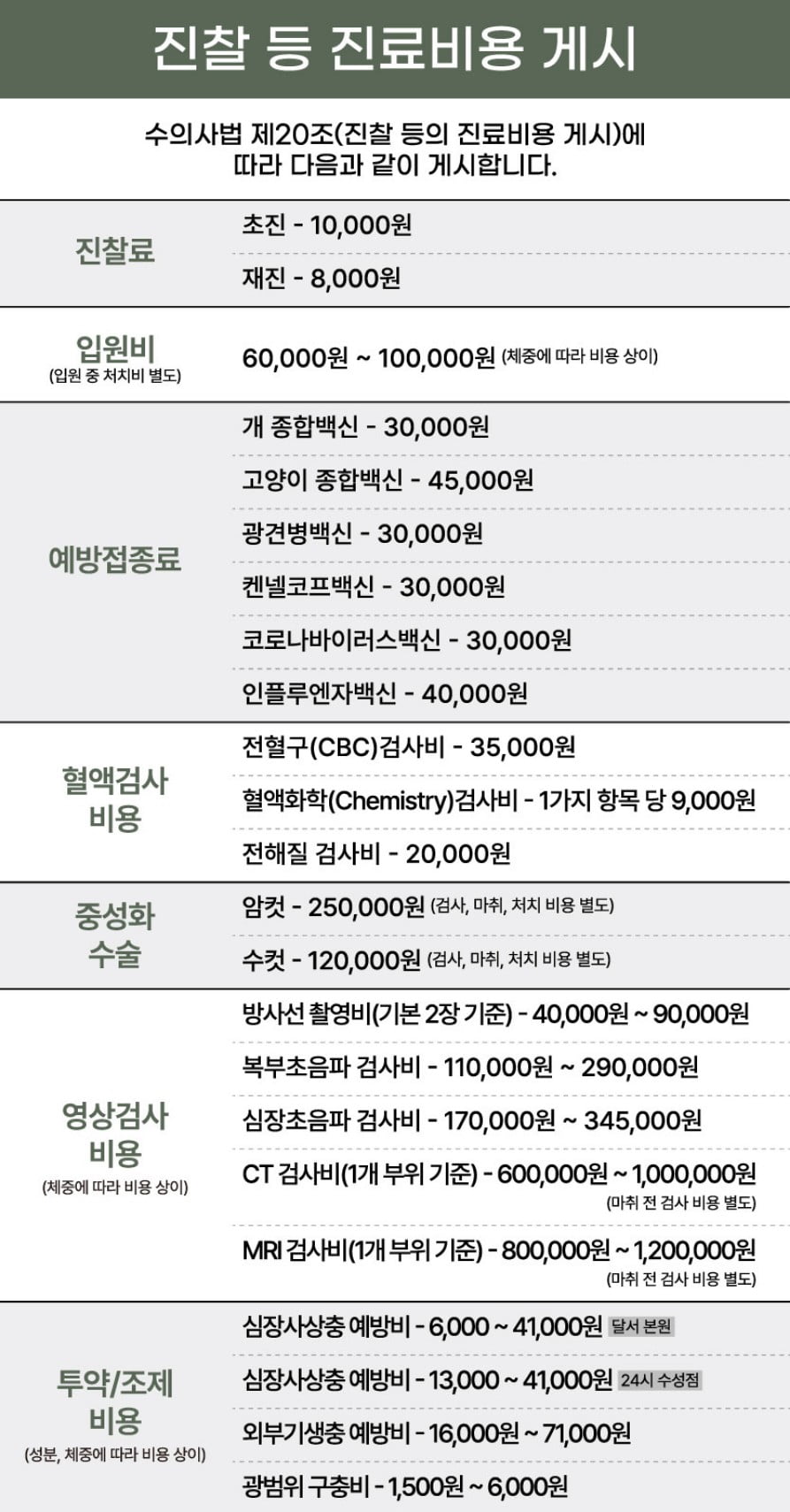 반려동물의 건강을 최우선으로 생각하는 전문 건강검진 시설을 갖추고 있으며 쾌적하고 안전한 환경에서 우리 아이가 편안하게 검진을 받을 수 있도록 최적의 환경을 갖추고 있습니다.